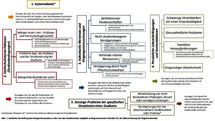 In spite of academic reforms aiming at shorter study periods, there are still students exceeding the specified course duration. Thus, it is of great interest for university managers to know where the causes for exceeding the specified course duration can be found, in order to be able to take appropriate measures. In a first sub-project, reasons for exceeding the standard period of study were identified and systematized in order to develop questionnaires for the collection of relevant causes. For this purpose, reasons for long study times emerging from the literature were systematized and categorized. As a further source for the categorization, qualitative data (N = 565) from a student survey at the FAU were used and its content analyzed. The results of the project may provide starting points for the development of scales for the assessment of causes of exceeded standard periods of study at different levels (i.e. intra-university factors, individual characteristics and initial requirements of students and personal situation of students and contextual factors).
